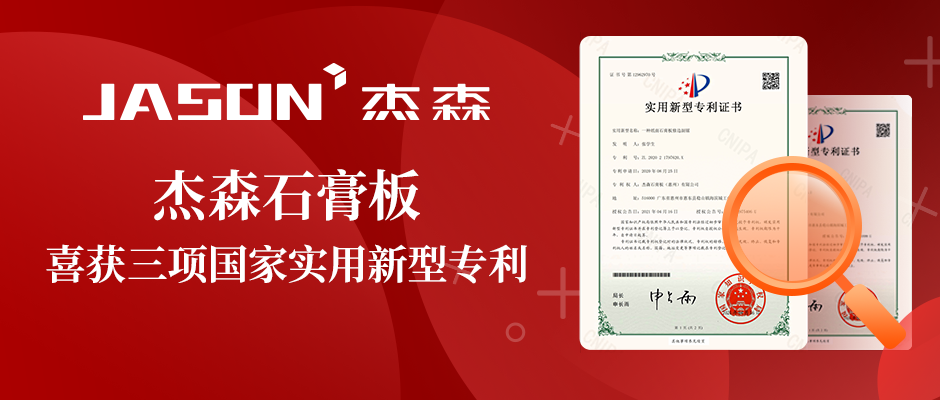 杰森石膏板國家專利又添新成員啦!日前,從國家知識產權局獲悉,杰森石膏板(惠州)有限公司申報的“一種紙面石膏板修邊副鋸”、“一種打包機偏心輪拉緊裝置”、“一種對齊緩沖裝置” 等3項實用新型裝置獲得國家專利授權,讓杰森知識產權庫再度擴容。截止到目前,杰森石膏板獲得授權的國家專利數量20余項。