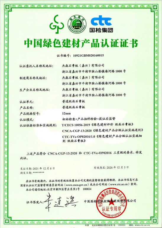 2021年12月6日,經過國檢集團認證評價中心技術專家的嚴格評審,杰森石膏板順利通過了中國建材檢驗認證集團股份有限公司(CTC)的認證審核,榮獲“中國綠色建材產品”三星級認證證書。