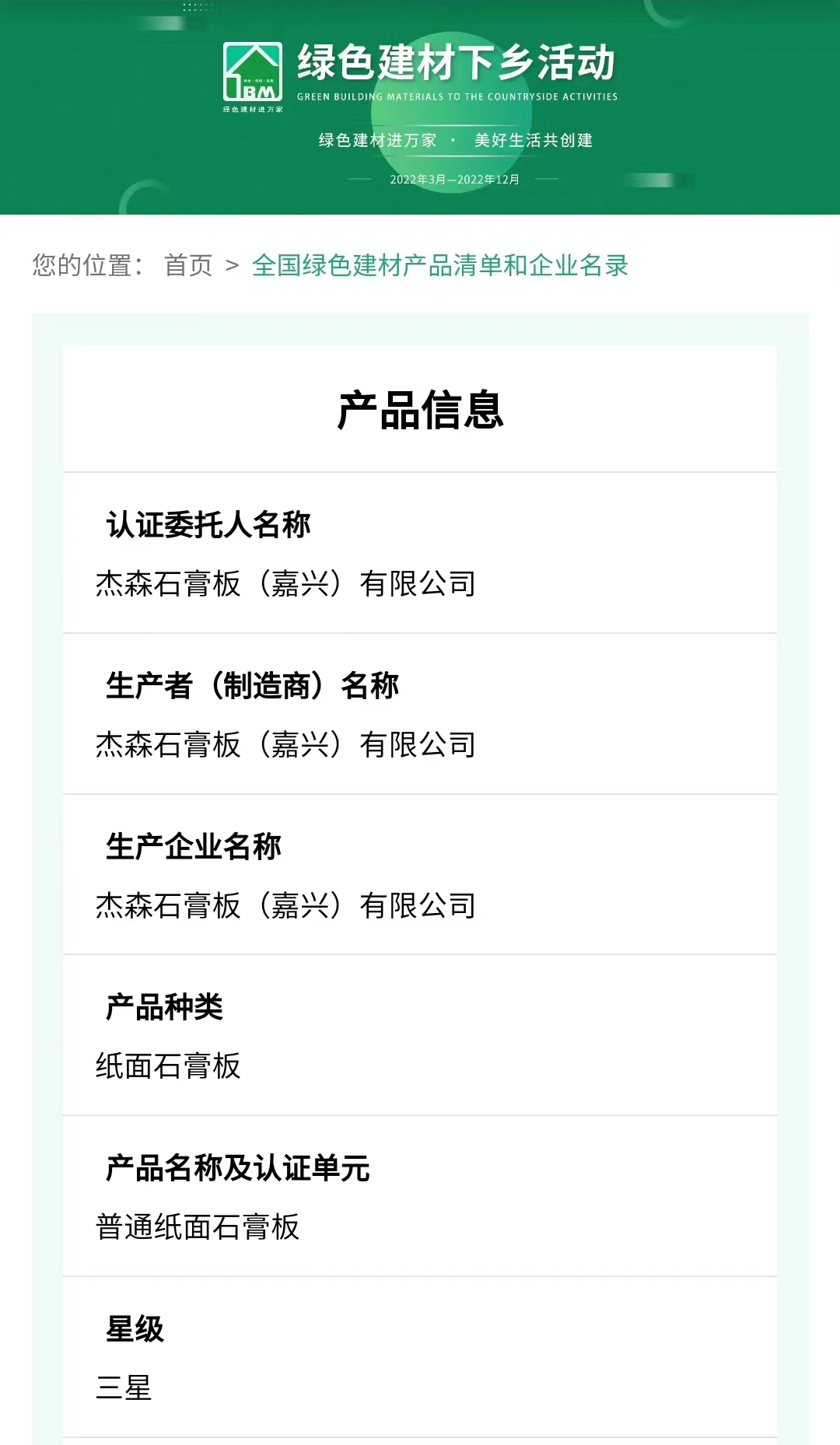 作為首批入圍2022年綠色建材下鄉活動產品清單及企業名錄的綠色建材企業,多年來,杰森公司一直致力于綠色環保建材的開發、生產及應用,積極推進工業副產品——脫硫石膏的綜合利用與協同處置,為社會提供工業固廢的無害化處置方案,為市場提供質量可靠、綠色環保的石膏板建材產品及系統解決方案。2021年,杰森旗下普通紙面石膏板產品通過首批中國綠色建材產品認證三星級證書,被納入財政部主導的政府采購支持綠色建材促進建筑品質提升試點工作。此外,杰森公司及旗下多款產品還通過相關權威檢測部門的綠色建材和環境質量等認證,先后榮獲“十三五”綠色智慧建造技術科技創新重點計劃(攻關)項目、綠色房地產全精裝成品房優秀供應商等榮譽稱號。