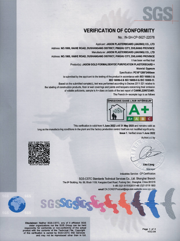 杰森旗下高端家裝石膏板產品——杰森黃金凈醛板+通過了在國際上享有極高聲譽的法國室內空氣環境檢測A+認證,這是該產品繼歐盟CE認證之后,取得的又一項國際權威認證,標志著杰森黃金凈醛板+在綠色環保安全品質方面,再次獲得國際權威機構的認可。